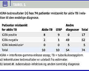 Konklusion: IGRA havde en betydelig falsk positiv rate samt lav sensivitet ved benyttelse til diagnosticering af aktiv tuberkulose svarende til det anførte i nylige meta-analyser. Lægernes viden om indikationerne for IGRA's benyttelse og tolkning var suboptimal, idet den hyppige brug til diagnostik af aktiv TB ikke stemte overens med de internationale eller de danske retningslinjer. Ligesom Mantouxtesten kan IGRA ikke skelne latent M. tuberculosis infektion fra aktiv TB-sygdom.