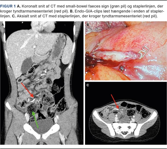 En tiårig rask dreng fik foretaget laparoskopisk appendektomi for ukompliceret appendicitis acuta. En endo-GIA blev brugt til at dele appendix fra caecum. Patienten blev udskrevet kort efter operationen. Fem dage postoperativt blev han genindlagt med akut indsættende kraftige smerter i højre fossa iliaca med turevise forværringer, eksplosive opkastninger, manglende afføring gennem to dage og behandlingsrefraktære smerter. Klinisk fremstod han bleg og svært smertepåvirket. Ved palpation af abdomen fandtes diffus slipømhed, mest udtalt i højre fossa iliaca. Biokemi viste leukocytter på 20,6 × 109/l, C-reaktivt protein (CRP) 20 mg/l, laktat 3,9 mmol/l. Lavdosis-CT af abdomen viste dilaterede tyndtarmsslynger i det lille bækken med mulig overgangszone ved caecum. Der blev foretaget laparoskopi og fundet en delvist åben clips i den ene ende af staplerlinjen på caecum. Clipsen krogede sig ind i et segment af tyndtarmsmesenteriet (Figur 1). Den åbne clips sad yderligt i staplerlinjen. I tillæg var cirka to meter tyndtarm hernieret under clipsen og dannede en closed loop-konfiguration, defineret ved, at et tarmsegment afklemmes to steder i sit forløb, og fremstod med venøs stase i mesenteriet, uden nekroser. Adhærencen til clipsen blev delt skarpt, og afklemningen af tarmen var hermed ophævet. Tarmen observeredes, og der var hurtigt tegn til bedret blodforsyning. Tarmen var vital med peristaltik i hele sin længde, og der var ikke behov for resektion. Patienten var i klinisk bedring umiddelbart efter operationen og blev udskrevet samme døgn med mave-tarm-funktion og smertefrihed.
