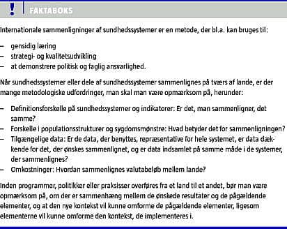 Summary International comparisons of health systems Ugeskr Læger 2010;172(10):771-774 International comparisons of health systems are widely used as a method for cross country learning, strategy development at the national level, and to demonstrate accountability. Comparisons may comprise entire health systems or subsystems within these, and may include many or few health systems. This paper describes strengths and weaknesses of different types of comparisons and methodological challenges involved in comparing different health systems. Finally, the paper emphasizes that caution must be exercised when transferring ideas from one system to another.