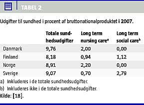 Et andet problem er forskelle i afgrænsninger af, hvad der i de enkelte lande defineres som udgifter til sundhed. Den måske vanskeligste gråzone er såkaldt langtidspleje til ældre og handicappede borgere, og her er spørgsmålet, hvad der hører ind under sundhed, og hvad hører ind under det sociale system. OECD anfører i definitionsforskrifterne, at den medicinske del af langtidspleje (Long Term Nursing Care (LTNC)) skal med som sundhedsudgift, mens den sociale del af langtidspleje (Long Term Social Care (LTSC)) ikke skal medtages. Denne forskrift fortolkes forskelligt af de 30 medlemslande. Tabel 2 viser totale sundhedsudgifter i procent af BNP for de fire nordiske lande. Danmark og Norge medtager stort set alle ældreplejeudgifter under sundhedsudgifter i stedet for at angive specifikke LTSC-udgifter. Finland og Sverige derimod definerer kun dele af deres langtidspleje som LTNC, dvs. som sundhedsudgift, mens resten defineres som LTSC. Det er således uklart, om der er tale om forskellige udgiftsniveauer eller om forskellige afgrænsninger af, hvad der defineres som sundheds- henholdsvis socialudgift.