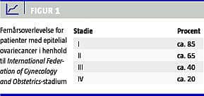 Epitelial ovariecancer (EOC) er den mest letale gynækologiske cancer med en dårlig prognose og en femårs overlevelse på omkring 50% for alle stadier (Figur 1 ). Der investeres mange resurser på behandlingen af disse patienter, der nu er skemalagt i pakkeforløb. Der er i Danmark sket en centralisering af behandlingen på de fem gynækologisk-onkologiske centre, og de kirurgiske procedurer er under stadig udvikling i retning af mere avanceret og ekstensiv kirurgi. Patienterne tilbydes kemoterapi, og ved recidiv behandles på ny.