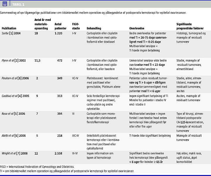 Et norsk studie [3] bestod af 349 patienter med ovariecancer i FIGO-stadie IIC-IV. Gruppen af patienter uden resttumorvæv og med TI af mere end seks ugers varighed havde en dårligere overlevelse end patienter med TI af mindre end seks ugers varighed, men forskellen var ikke signifikant. Patienter med TI mindre end seks uger var yngre og havde en bedre almentilstand end patienter, som påbegyndte kemoterapi efter seks uger. Gadduci et al [4] fandt i et retrospektivt studie med 313 patienter, som fik taxane- og platinumbaseret kemoterapi, at TI ikke havde signifikant betydning.