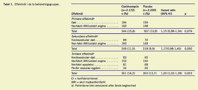 I flere undersøgelser har man påvist en positiv association mellem Chlamydia pneumoniae -antistoffer og forekomsten af kardiovaskulære komplikationer [1, 2]. Chlamydia pneumoniae er blevet påvist i aterosklerotisk væv. I to mindre randomiserede placebokontrollerede forsøg, der inkluderede patienter med akut iskæmisk syndrom, påvistes en signifikant lavere kardiovaskulær morbiditet hos patienter randomiseret til makrolidantibiotikum. På baggrund af ovenstående observationer gennemførte vi et forsøg med clarithromycin for at teste hypotesen: Kan behandling med et makrolid reducere forekomsten af kardiovaskulære hændelser hos patienter med stabil iskæmisk hjertesygdom [1, 2]?