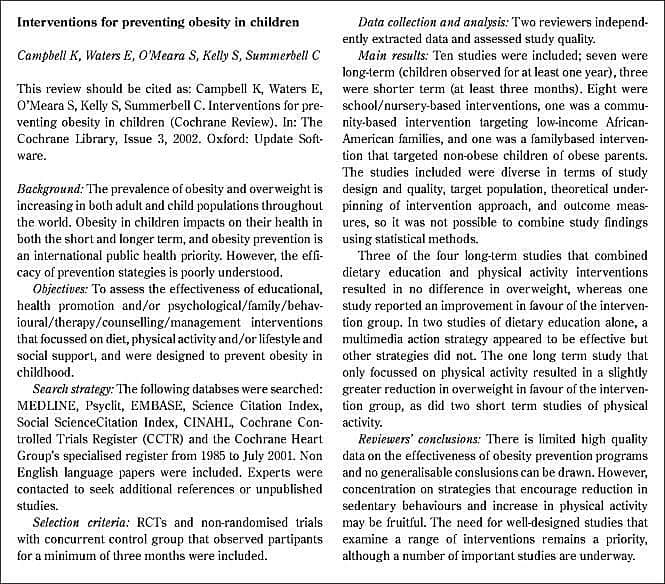 - Campbell K, Waters E, O'Meara S, Summerbell C. Interventions for preventing obesity in children (Cochrane Review). The Cochrane Library, Issue 1, 2001. Oxford: Update Software.
