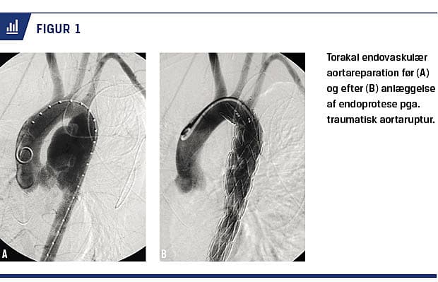 Torakale endoproteser (TEVAR) kan anlægges stadigt mere proksimalt i aorta enten med proteser med sidegrene eller i hybridkombination med kirurgisk transposition af de brakiocefale arterier, således at også nogle dissektioner og aneurismer, der medinddrager arcus, kan behandles endovaskulært. Ved traumatisk aortaruptur (Figur 1) er mortaliteten efter TEVAR nedbragt til under 10%, så hvis det er teknisk og logistisk muligt, er TEVAR førstevalget til patienter med traumatisk aortaruptur.
