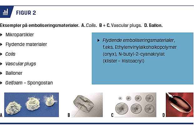 Der findes et stort sortiment af emboliseringsmaterialer (Figur 2). Nogle virker temporært, mens andre er permanente. Ved koagulopati anvendes ikke standard-
