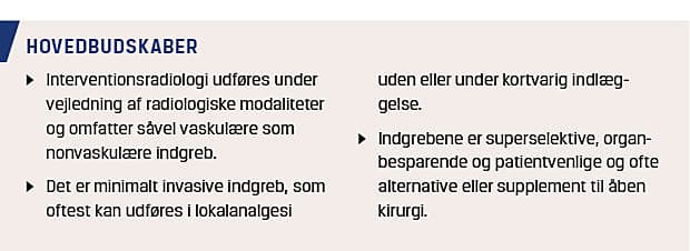 Interventional radiology (IR) is a fast expanding field which includes vascular (arterial and venous) as well as non-vascular topics. IR is minimally invasive methods, which are performed under guidance of radiological modalities. The methods are in general patient-friendly and organ-sparing procedures and can often be performed on out-patient basis or with short admission to the hospital and with short reconvalescence and economic advantages compared with corresponding surgical treatments. IR has in some cases substituted former surgical procedures. Technological development has facilitated increasing IR treatment offers and indications, and there is a high level of evidence for many of the offers.