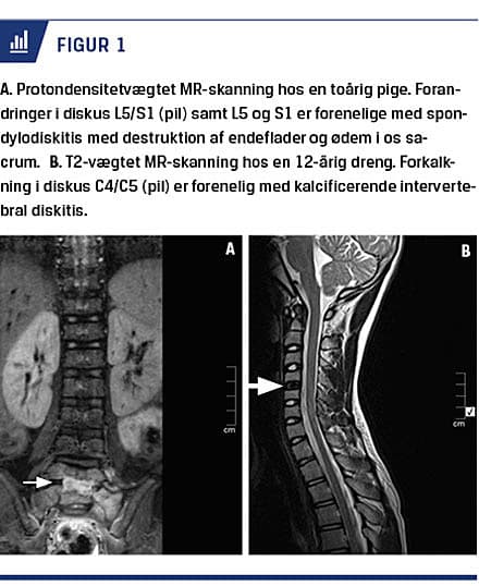 Intervertebral diskitis hos børn er en sjælden tilstand, som let overses [1]. Det er en infektion eller inflammation, der rammer den intervertebrale diskus, evt. inddrager tilstødende vertebrae og resulterer i spondylodiskitis. Den præcise incidens kendes ikke, men tilstanden rammer formentlig årligt 1-2 ud af 32.500 børn, der er set ved pædiatriske konsultationer, og menes at udgøre 3% af alle osteoartikulære infektioner hos børn [2, 3]. Tilstanden giver ofte uspecifikke symptomer som irritabilitet, nedsat appetit, mavesmerter, natlige smerter og påvirket motorik, typisk i form af halten [4, 5]. Da infektionstallene kan være upåvirkede og bloddyrkninger give negative resultater, kan diagnose og behandling forsinkes [6].