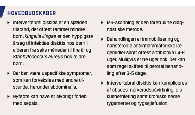 Intervertebral diskitis hos børn er sjælden. Den er vanskelig at diagnosticere, fordi symptomerne er uspecifikke og kan forveksles med lidelser fra mange andre organsystemer. Tidlig diagnostik kan forkorte forløbet og forebygge alvorlige komplikationer.