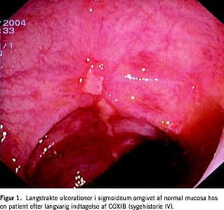 IV. En 48-årig kvinde med et tidligere mangeårigt NSAID-forbrug mod slidgigt blev i fire år behandlet med celecoxib 400 mg daglig. Hun blev indlagt med akut indsættende, stærke abdominalsmerter samt frisk blødning og koagler per rectum. Ved en koloskopi sås der striktur på grundlag af langstrakte ulcerationer i sigmoideum omgivet af normal mucosa (Figur 1). Histologien viste inflammation med kirtelhenfald og ulcerationer med fibrinbelægninger, fibrose i lamina propria og ingen kryptabcesser eller granulomer. Efter seponering af celecoxib forsvandt patientens gener og de endoskopiske forandringer.