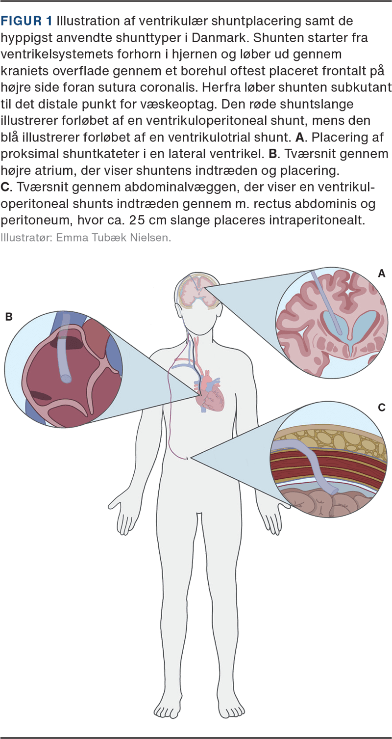 Grundprincippet bag shuntbehandling er normalisering af liquordynamikken ved drænage af CSV fra ventrikelsystemet til det systemiske kredsløb. Returneringen til kredsløbet er hyppigst via peritoneum ved en VP-shunt, eller via hjertets højre atrium ved en ventrikuloatrial shunt (Figur 1) [2, 3]. Alternativt kan CSV dræneres til galdeblæren eller til det pleurale rum, eller CSV kan ledes fra det lumbale subaraknoidalrum til peritoneum ved en lumboperitoneal shunt [4]. Shuntanlæggelse benyttes oftest til behandling af hydrocephalus, en lidelse karakteriseret af forstørrede ventrikler grundet uoverensstemmelse mellem CSV-produktion og CSV-absorption, og i begrænset omfang til idiopatisk, intrakraniel hypertension [5, 6].