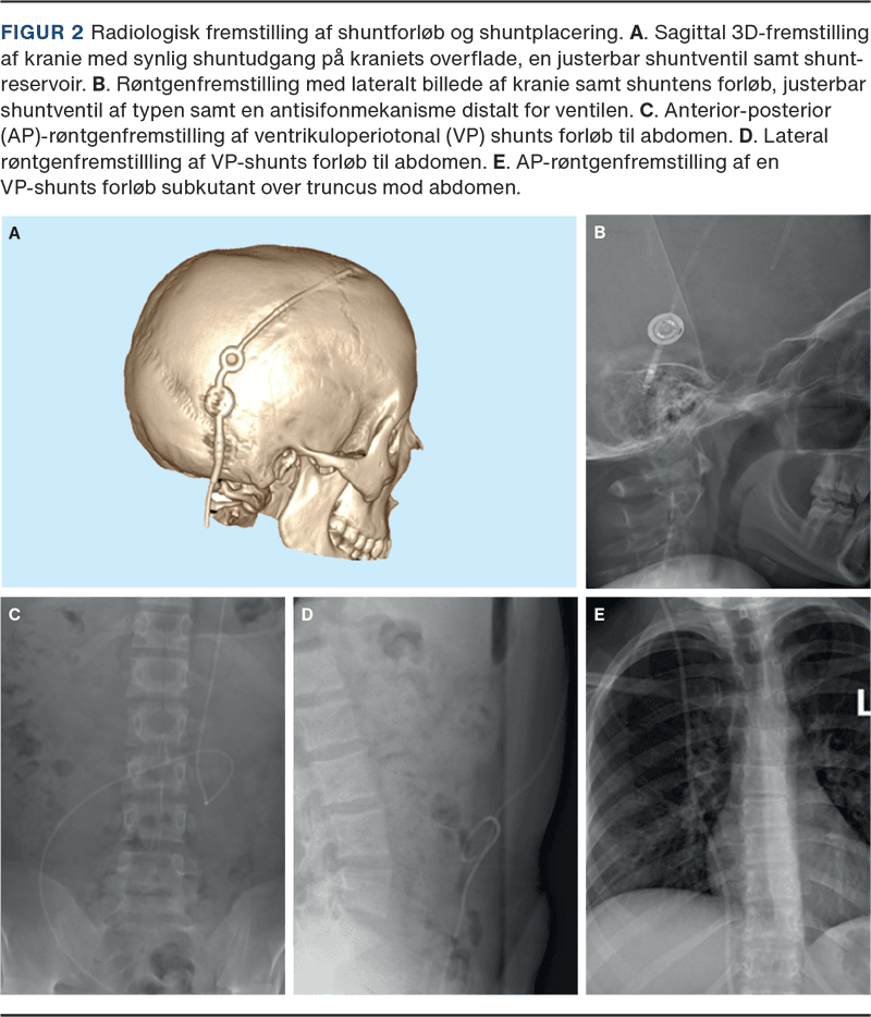 Radiologisk billeddiagnostik har en stor plads i shuntdysfunktionsudredning (Figur 2). Konventionel røntgenundersøgelse anvendes til billedfremstilling af shuntserier, hvor projektionerne anterior-posteriort plan og lateralplan kan fremstille shuntens forløb kranielt, torakalt og abdominalt. CT eller MR-skanning af cerebrum anvendes til vurdering af cerebral ventrikel-størrelse, subdurale ansamlinger (hygromer, hæmatomer) og udelukkelse af differentialdiagnoser. Uændrede intrakranielle forhold udelukker dog ikke shuntdysfunktion.