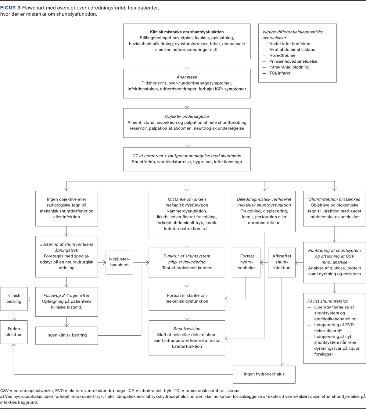 Hjerneventrikelshunts er standardbehandling i en lang række tilfælde af hydrocephalus. Shuntdysfunktion er en hyppig komplikation hos shuntopererede patienter og kendetegnes især ved stillingsbetinget hovedpine, kvalme, eksplosive opkastninger og i mere sjældne tilfælde bevidsthedspåvirkning. Systematisk tilgang er vigtig for tidlig udredning af shuntdysfunktion. Patienter med hydrocephalus og udtalte symptomer eller mistanke om ICP-stigning kræver akut intervention og overflytning til en neurokirurgisk afdeling.
