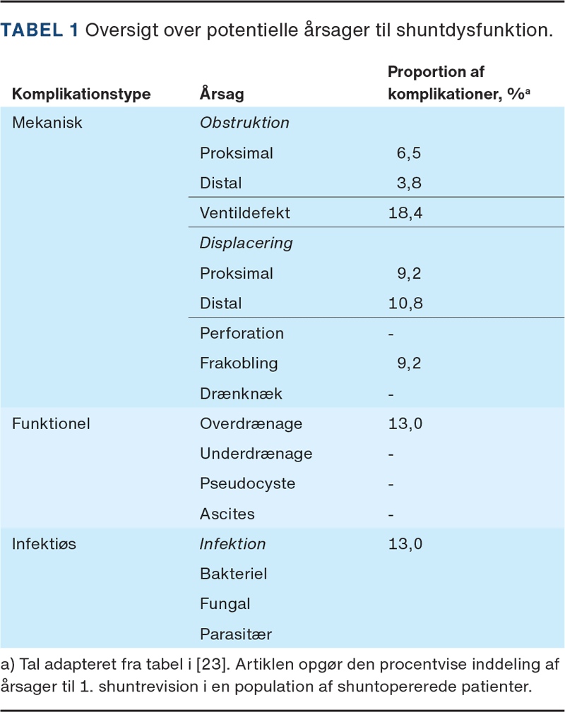 Hyppige årsager til shuntdysfunktion inddeles i tre kategorier: mekanisk, funktionel og infektiøs (Tabel 1) [19, 20].