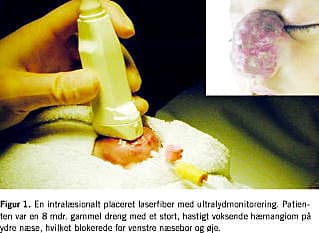 Behandlingen foregår i generel anæstesi. Ved risiko for nervepåvirkning anvendes der nervemonitorering. Diodelaserfiberen introduceres ultralydvejledt i læsionen gennem en kanyle eller et angiokateter (Figur 1 ). Eventuelle visualiserbare kar identificeres med Dopplerfunktionen, laserfiberens spids placeres intravaskulært, hvorefter karret kan lukkes ved applikation af energi fra fiberen. Den resterende del af læsionen behandles under kontinuerlig ultralydmonitorering ved applikation af laserenergi i et radiært mønster gennem en eller flere punkturer, afhængigt af læsionens udbredelse. Vævet behandles til palpatorisk fasthed, og indtil dets densitet ændres på ultralydskanningen.