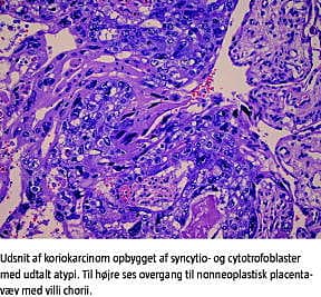 Koriokarcinom er en sjælden diagnose, som ofte stilles, når patienten får symptomer ante eller post partum. Der er tidligere beskrevet enkelte tilfældige fund af intraplacentært koriokarcinom (også kaldet koriokarcinom in situ) [1]. Det intraplacentære koriokarcinom er ofte beskrevet makroskopisk som et lille, lyst gulligt område ikke uligt placentære infarkter [5], hvorfor den korrekte incidens muligvis er højere end hidtil antaget. Intraplacentære koriokarcinomer kan medføre føtomaternel blødning og resultere i løsning af placenta, hydrops foetalis, foetus mortuus eller anæmisk barn, som beskrevet i vores sygehistorie [5]. I det aktuelle tilfælde er mor efterfølgende blevet testet for føtalt hæmoglobin, noget som har bekræftet mistanken om føtomaternel blødning som årsag til barnets svære anæmi. I tilfælde som ovenfornævnte og i tilfælde, hvor der findes infarktlignende områder i placenta, kunne man overveje, om der rutinemæssigt skulle udføres histologisk undersøgelse af placenta.