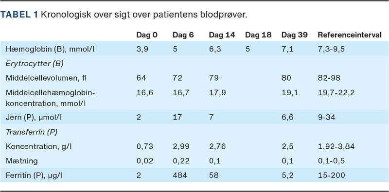 Præoperative blodprøver viste en hæmoglobinkoncentration på 3,9 mmol/l, hvorfor patienten blev adspurgt til symptomer på anæmi. Hun afviste alle symptomer forenelige med anæmi, og hun havde afsluttet sin menstruation fem dage forinden. Hun tog ikke peroralt jerntilskud habituelt og havde ingen specielle kostpræferencer. Ved supplerende blodprøver blev der konstateret mikrocytær jernmangelanæmi med disse koncentrationer: hæmoglobin 3,9 mmol/l og jern 2 μmol/l samt transferrinmætning på 0,02 (Tabel 1).
