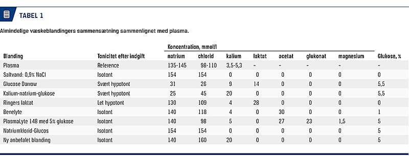I de 19 randomiserede studier blev der primært anvendt to isotone væsker: isotont saltvand med en natriumkoncentration på 154 mmol/l og 5% glukose samt PlasmaLyte 148, en såkaldt balanceret væske med en natriumkoncentration på 140 mmol/l og 5% glukose, men hvor en del af chloridindholdet er erstattet af andre anioner, bl.a. acetat, glukonat og laktat (Tabel 1). Baggrunden for brugen af balancerede væsker er bl.a., at isotont natriumchlorid kan inducere metabolisk acidose [22]. Vi har ikke kendskab til randomiserede studier med hverken børn eller voksne, hvor man har