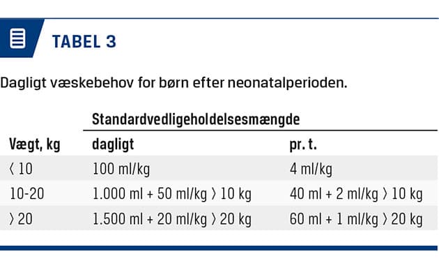 Vi anbefaler, at væskemængden som standard ordineres efter Holliday-Segars formel (Tabel 3). Nogle børn har muligvis et mindre væskebehov, mens andre har et større behov, f.eks. pga. feber eller påskyndet respirationsfrekvens. Behovet vurderes individuelt, særligt ved længerevarende behandling. Vægt, klinisk hydreringsstatus og blodprøver med elektrolytter og glukose vurderes dagligt hos børn der får i.v.-væske. Aftrapning af i.v.-væskebehandling kan med fordel forsøges påbegyndt så hurtigt som muligt, idet det ofte er en forudsætning for, at barnet begynder at drikke. Peroralt indtag er det sikreste for barnet.
