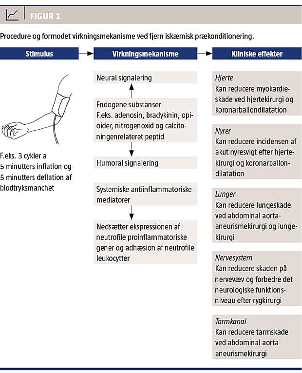 Resultaterne af eksperimentelle og kliniske studier tyder på, at FIPK-stimulus transmitteres fra det prækonditionerede væv til målorgan/-væv via humorale, neurale og systemiske antiinflammatoriske mediatorer, der produceres under prækonditioneringen [10-15]. Den humorale og neurale signalvej bygger formentlig på endogene substanser såsom adenosin, bradykinin, opioider, nitrogenoxid og calcitoningenrelateret peptid [15], mens det systemiske respons formodentlig skyldes en genmodulering af immun-celler [13, 14] (Figur 1).