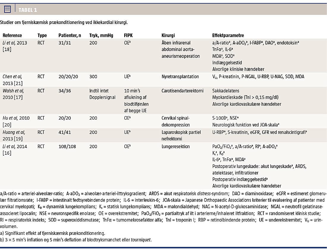 Effekten af FIPK ved ikkekardial kirurgi er blevet undersøgt i seks randomiserede kliniske studier om større karkirurgi [17, 18], urologi [19], transplanta-tionskirurgi [21], rygkirurgi [20] og lungekirurgi [16]. De seks studier er alle mindre hypotesegenererende studier med surrogatmarkører såsom partialtryk af ilt i arterierne/inhaleret iltfraktion, eGFR og S100B som primære effektparametre. I alt viste to ud af de seks kirurgiske studier ikke en signifikant effekt af FIPK på den primære effektparameter [17, 21]. Manglende statistisk styrke kan være årsagen til den manglende effekt af FIPK før operation for carotisste-nose [17]. Styrkeberegningen viste, at 32 patienter var påkrævet i hver arm, mens kun 55 af de i alt 70 inkluderede patienter gennemførte målingen af den primære neurologiske effektparameter [17]. Herudover forekom det primære kardiale endepunkt (stigning i S-troponin I > 0,15 mg/dl) udelukkende hos én patient i hver arm. Tilsvarende kunne der ikke påvises en effekt af FIPK ved nyretransplantation [21]. Studiet var designet således, at FIPK kun blev foretaget hos donor eller recipient. Idet mekanismerne bag FIPK formentlig både er neurale, humorale og systemisk antiinflammatoriske, kunne den manglende effekt skyldes, at nyre-graft’en ikke var beskyttet af de prækonditionerende mekanismer gennem hele transplantationsforløbet fra donor til recipient [1]. Et fremtidigt alternativ kunne være at udføre FIPK på donor og recipient.