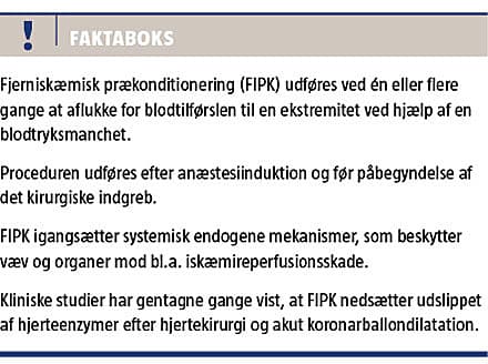 Iskæmireperfusionsskade er betegnelse for det paradoks, at genoprettelsen af blodtilførslen til et iskæmisk væv eller organ medfører yderligere skade på dette [3]. Klinisk har FIPK vundet frem inden for kardiologien, hvor proceduren udført i ambulancen før den akutte koronare ballonudvidelse er påvist at reducere skaden ved akut myokardieinfarkt [4]. Større hjertekirurgiske studier har vist, at FIPK udført umiddelbart før det kirurgiske indgreb reducerer det postoperative udslip af hjerteenzymer [5-7] og mortalitet [5]. Den kliniske effekt undersøges p.t. i to større fase III-multicenterstudier [8, 9].