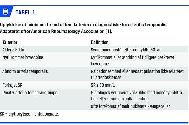 Arteritis temporalis (AT) er en systemisk, granulomatøs vaskulitis, der forekommer i store og mellemstore kar. Diagnostik af AT kompliceres af en til tider broget sym-ptomatologi, der hyppigst omfatter feber uden fokus, hovedpine, vægttab, skalpømhed, tyggeclaudicatio og synstab [1]. Incidensen af AT blandt vestlige befolkninger er angivet til at være 20 pr. 100.000 i aldersgruppen over 50 år, og lidelsen ses hyppigst hos patienter