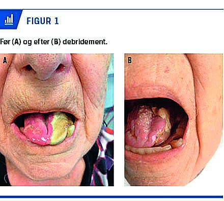 mistanke om infektion. Måling af niveauerne af antinukleære antistoffer, antineutrofile cytoplasmatiske antistoffer og tuberkulosetiter var negative, bloddyrkning var uden vækst, malariaudstryg var negativ, og hverken CT eller PET gav en forklaring på patientens symptomer. Der var ingen overbevisende bedring igennem en måneds indlæggelse ud over spontan remission af atrieflimren. Patienten bemærkede begyndende smerter i tungen samt let sløret syn venstresidigt. Objektivt sås en skarpt markeret, hvidlig misfarvning af venstre tungerand, området var nekrotisk og debrideredes spontant ved manipulation (Figur 1). Grundig øre-næse-hals-undersøgelse inkl. fiberlaryngoskopi og UL-skanning af halsen viste i øvrigt normale forhold.