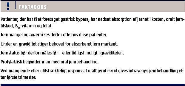 In Denmark, the number of women in reproductive age having Roux-en-Y gastric bypass surgery increased in the period 2007-2010. The malabsorption related to the operation implies a predisposition to macro- and micronutrient deficiencies, which in pregnancy may influence the development of the foetus. The article concerns the need for managing the malabsorption syndrome, iron deficiency in particular, both in antenatal care, during pregnancy, delivery and in the lactation period. We suggest frequent follow-up in these patients and intravenous iron therapy, when oral iron treatment is inadequate.