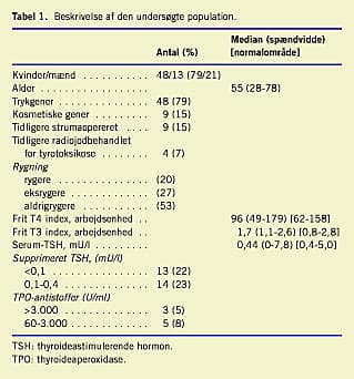 Retrospektivt blev data på konsekutive patienter, der havde fået målt 24-timers-jodoptagelse på Amtssygehuset i Herlev i perioden fra 2001 til 2003 analyseret. Patienter med hypertyreose, defineret som lav thyroideastimulerende hormon (TSH) (< 0,1 mU pr. l) samt enten højt niveau af frit T3-index eller frit T4-index, blev ekskluderet. I alt inkluderedes 61 patienter som er karakteriseret i Tabel 1 .