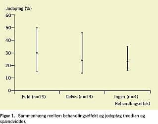 Korrelationen mellem jodoptagelse og behandlingseffekt viste ingen sikker sammenhæng, men en svag tendens til bedre effekt ved højere jodoptagelse (Figur 1 ). Endvidere så vi patienter med en jodoptagelse på under 20% med både fuld og delvis effekt af radiojodbehandlingen. I undersøgelsen fandtes ingen sammenhæng mellem TSH og jodoptagelse.