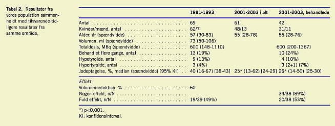 Resultater: Median 24-timers-jodoptagelse var 25% (13-62%), mens median jodoptagelse fra 1980-1992 var 40% (16-67%). Efter jodoptagelsen blev 42 patienter behandlet med radioaktiv jod med mediandosis på 600 MBq (spændvidde 200-600). Ti patienter fik yderligere en dosis radioaktivt jod. Hos 38 ud af 42 kunne effekten vurderes ( > 6 mdr. fra behandling). Af disse havde 34 (90%) effekt af behandling, heraf 53% fuld effekt og 37% delvis effekt vurderet af patient og læge. Af de behandlede fik fire patienter hypotyrose (10%), en stråletyrotoksikose (2%) og tre Graves' sygdom (5%).