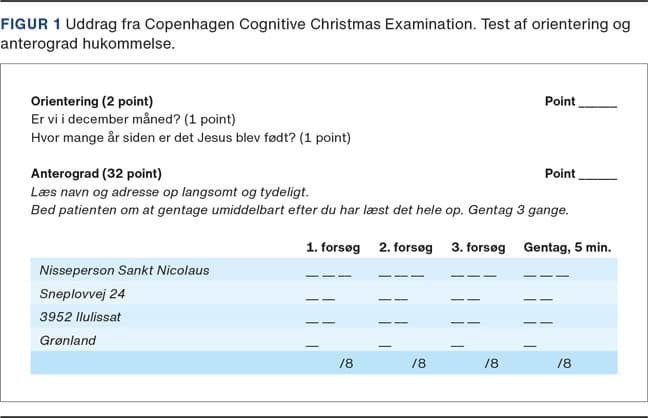 Juletid er hyggetid og forbundet med glædelige minder [5]. Vi har derfor udarbejdet en test med juletema, hvorved julens glæder kan tilføjes som element i en ellers temmelig objektiv kognitiv test. Hensigten var at konstruere en test, der nøjagtigt testede kognitive delelementer på en motiverende og muligt opløftende vis. Resultatet af disse bestræbelser er blevet til testen Copenhagen Christmas Cognitive Examination (CCCE) (Figur 1). Vores hypotese var, at CCCE kunne øge motivationen for kognitiv testning og muligvis ville medføre en positiv emotionel reaktion på de undersøgte.