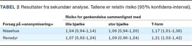 Tabel 2 viser resultaterne fra den sekundære analyse, i hvilken effektiviteten af »anonymisering« med nissehue og rensdyrforklædning blev sammenlignet med mere traditionelle teknikker.