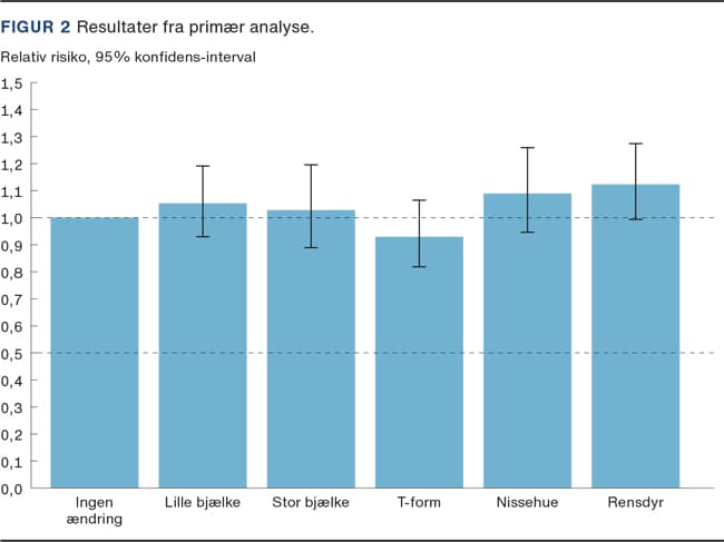 Figur 2 viser resultaterne fra den primære analyse. Højden af hver søjle repræsenterer den relative risiko for genkendelse af den portrætterede person med »ingen ændring« som reference. De vertikale sorte streger repræsenterer 95% konfidens-interval. Med »ingen ændring« som reference var der for alle de fem andre typer »anonymisering« en relativ risiko for genkendelse på 0,9-1,1. Alle estimaterne er statistisk signifikant forskellige fra 0,5. Sensitivitetsanalyser gav lignende resultater (se online appendix 6 [18]).