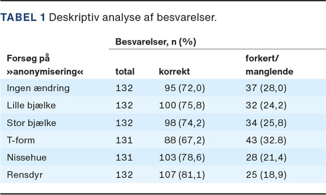 I alt 33 personer deltog i undersøgelsen, hvor de forsøgte at identificere 24 billeder hver. Besvarelser til to billeder blev slettet, fordi deltageren pga. en teknisk fejl i spørgeskemaet ikke kunne se billederne. Det endelige datasæt indeholdt derfor 790 observationer, fordelt på de seks forskellige typer »anonymisering«. I Tabel 1 opsummeres antallet af besvarelser inden for hver kategori af »anonymisering« og andelen af korrekte svar. Den samlede andel af korrekte svar var 74,8% med kun små variationer mellem kategorierne.