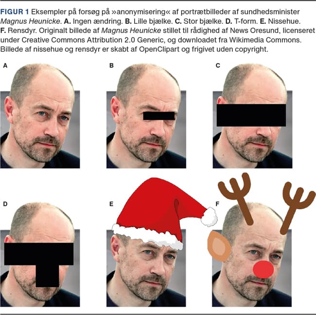 I den medicinske litteratur er der tradition for at forsøge at anonymisere patientfotos ved at placere sorte felter hen over øjnene på patienterne. Teknikken er dog ikke nødvendigvis effektiv, og Slue skrev allerede i 1989, at: »Masking may make the author or publisher think that the patient's identity is hidden, but all that the bars do is ruin the photograph«[1]. Selvom der heldigvis er kommet opmærksomhed på vigtigheden af at få informeret samtykke til offentliggørelse fra patienten, fortsætter de tvivlsomme forsøg på »anonymisering« af fotos. I de seneste år har Ugeskrift for Læger bragt talrige artikler, som var illustreret med patientfotos, hvor identiteten var forsøgt sløret med sorte felter (i tillæg til indhentelse af samtykke) [2-17]. Størrelsen af de anvendte felter varierede meget – fra to helt små firkanter, der kun lige netop dækkede øjnene [8], til felter, der dækkede store dele af ansigtet [4].