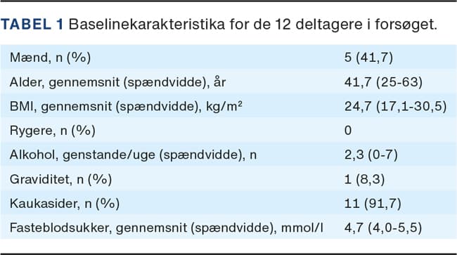 Vi screenede 14 deltagere hvoraf én måtte udgå pga. type 1-diabetes og en anden pga. graviditetsdiabetes. Vi inkluderede således 12 deltagere i alt. Baselinekarakteristika kan ses i Tabel 1. Forsøgsdeltagerne var yngre, overvejende kvinder med et gennemsnitligt normalt BMI og med et utroligt lille alkoholforbrug i forhold til den danske befolkning. Kun én person var ikke kaukasid, men asiat fra det før ukendte, men efter COVID-19 verdenskendte Wuhan.