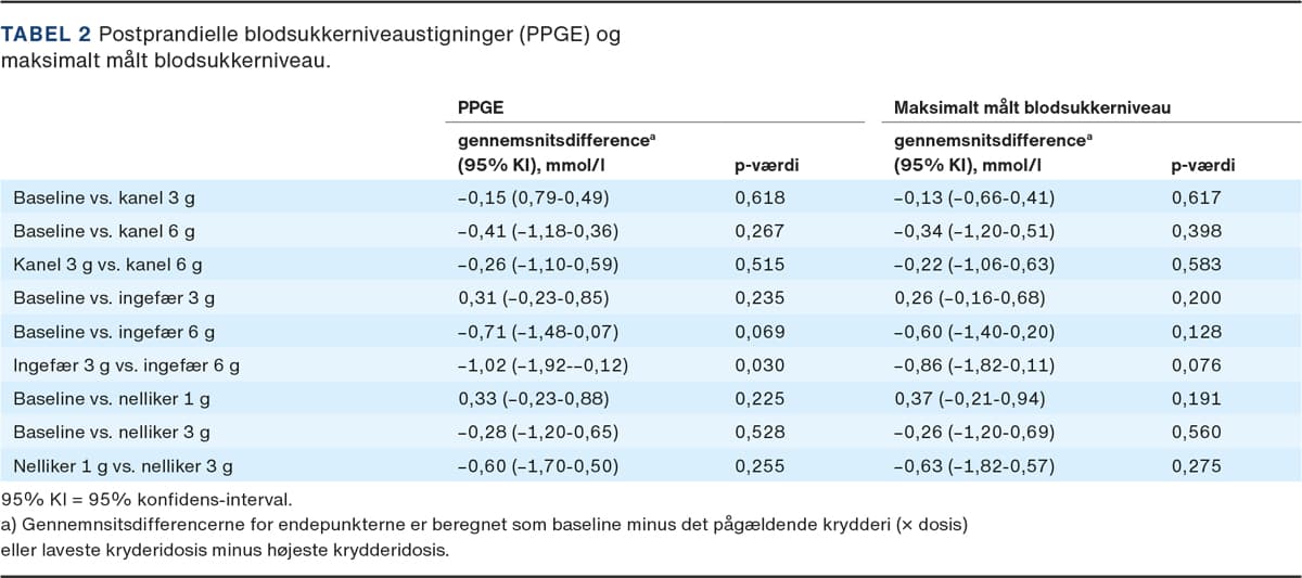 Der var ingen forskel i PPGE mellem baseline og risengrød med de forskellige krydderier uanset dosis (Tabel 2). Vi fandt en overraskende forskel i PPGE mellem 3 g ingefær og 6 g ingefær, med størst stigning i PPGE på 6 g ingefær (p = 0,030). Vi fandt ingen forskel i maksimalt målt blodsukkerniveau mellem krydderierne og baseline eller krydderidoserne imellem.