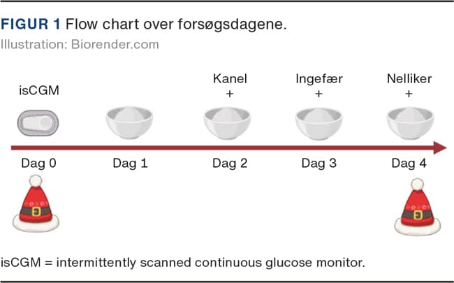 Forsøget forløb således (Figur 1): Dag 0: Påsætning af flashglukosemonitoreringssystemet. Dag 1: Risengrød uden krydderier til morgenmad og frokost. Dag 2: Risengrød til morgenmad og frokost med hhv. 3 og 6 g kanel. Dag 3: Risengrød til morgenmad og frokost med hhv. 3 og 6 g ingefær. Dag 4: Risengrød til morgenmad og frokost med hhv. 1 og 3 g stødt nellike.