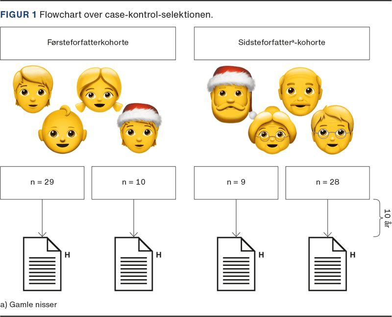 Vi lavede et bibliometrisk, incidence density-matched, prospektivt nested case-kontrol-studie. Cases var alle første- henholdsvis sidsteforfattere til en juleartikel i Ugeskrift for Læger i 2010-2012, og kontroller blev udvalgt blandt originalartikler i samme årrække.