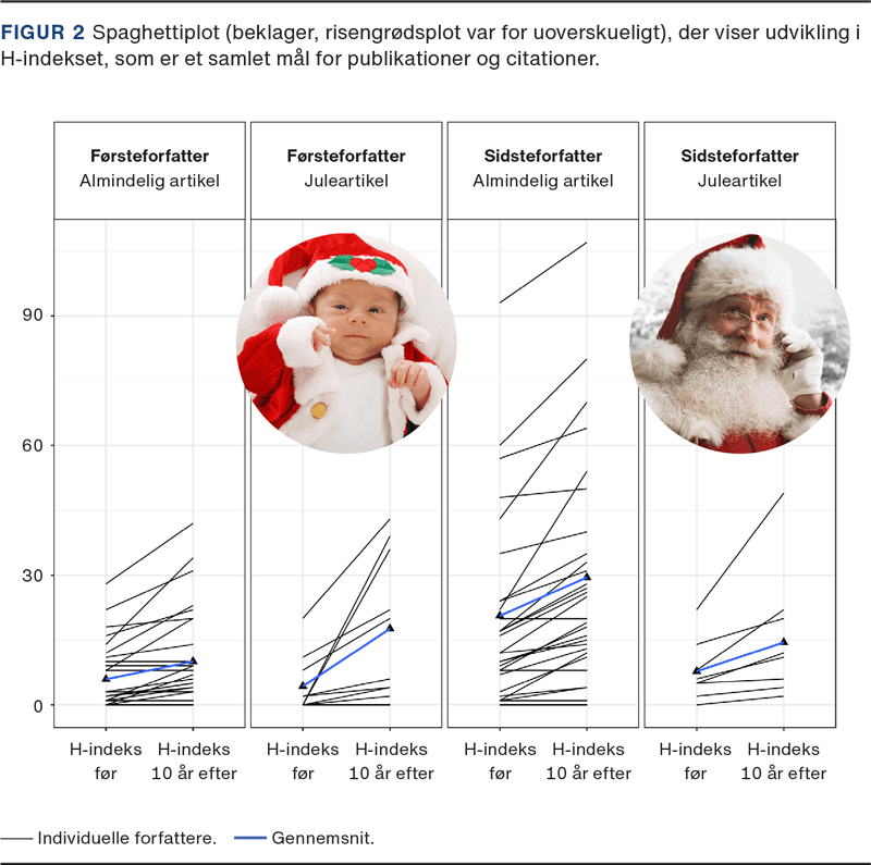 Juleartikler i medicinske tidsskrifter er blevet tiltagende populære [2], og studier, der undersøger særligt julerelaterede, fysiologiske fænomener, finder vej til velrespekterede tidsskrifter [3]. Idéen er at lade forskning, der beskæftiger sig med »skæve«, videnskabelige problemstillinger, komme til udtryk [4] i diverse videnskabelige tidsskrifter i julemåneden. Der findes sågar en Nobelpris for forskning i skæve, videnskabelige emner (Ig Nobel), der uddeles årligt af en »rigtig« nobelpristager [5]. Et tidligere studie har fokuseret på, hvor ofte selve juleartiklerne citeres mere eller mindre fejlagtigt [6]. Der resterer dog et spørgsmål om, hvad juleartikler i medicinske tidsskrifter kan gøre ved eller for ens videnskabelige karriere. Juleartikler vil nok generelt være vurderet som low-impact forskning, der ikke genererer mange citationer, hvilket er et vigtigt, bibliometrisk mål, der tages med i overvejelsen om at imødekomme fondsansøgninger og overbevise andre om, at man er »akademiker«, for at få en hoveduddannelsesstilling [7]. Desuden tager juleforskning tid fra »seriøs« forskning, og det kunne derfor tænkes, at videnskabsfolk, der engagerer sig i juleartikelskrivning, vil have mindre tid til andet arbejde og dermed præsterer dårligere i et akademisk miljø, der er afhængigt af citationer, der kan sammenlignes med likes på sociale medier. Omvendt er humor på arbejdspladsen associeret til velbefindende, hvilket kan højne motivationen for at arbejde [8]. Det er derfor nødvendigt med studier, der kan belyse, hvad juleartikelforfatterskaber gør for ens videnskabelige produktivitet vis a vis ens karriere. Om ikke andet har vi en personlig interesse i at vide det [9]. Som udgangspunkt havde vi den hypotese, at forfatterskaber til juleartikler er associeret med et negativt, bibliometrisk outcome, navnlig antallet af publikationer efter udgivelse af en juleartikel.
