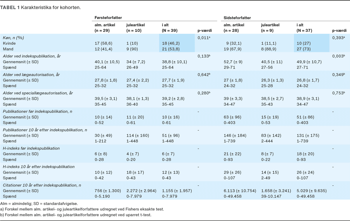 I Tabel 1 ses karakteristika for kohorten. Der var overvægt af mandlige juleartikelforfattere, og de var yngre end almindelige forfattere. Der var bred repræsentation blandt specialerne både i jule- og kontrolgruppe (data ej vist). For førsteforfatterne var der ikke forskelle ved indekspublikation på bibliometriske kernemål, hvilket til gengæld fandtes for sidsteforfatterne.