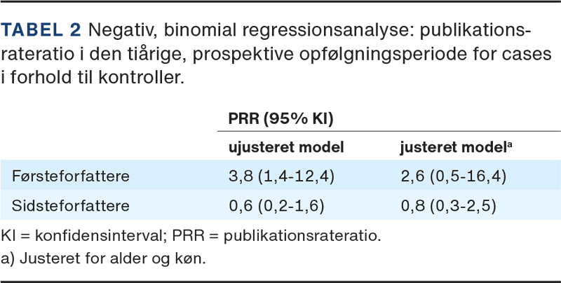 Gennemsnit med tilhørende spredning er opgivet for kvantitative variable. Vi analyserede sammenhængen mellem at have udgivet juleartikel og antal publikationer udgivet i den tiårige prospektive periode efter indeksår med en negativ, binomial regressionsanalyse, hvilket giver en oddsratio for cases i forhold til de på indekstidspunktet juleartikelfrie kontroller. Da vi benyttede incidence density matching, kan oddsratio fra en regressionsanalyse tolkes som en incidensrateratio – eller i dette tilfælde: en publikationsrateratio [12]. Alle analyser er udført ujusteret samt efterfølgende justeret for alder og køn. Vi foretog tjek af antagelser for negativ, binomial regression ved at sammenligne dispersion parameter med modeller kørt som Poisson-regression. Vi anvendte tosidede test, og signifikansniveauet blev sat ved p < 0,05. Statistikprogrammet R (version 4.2.2) blev brugt til alle analyser. De danske datamyndigheder kræver (forhåbentlig) ikke informeret samtykke, da alle oplysninger er frit tilgængelige på internettet.