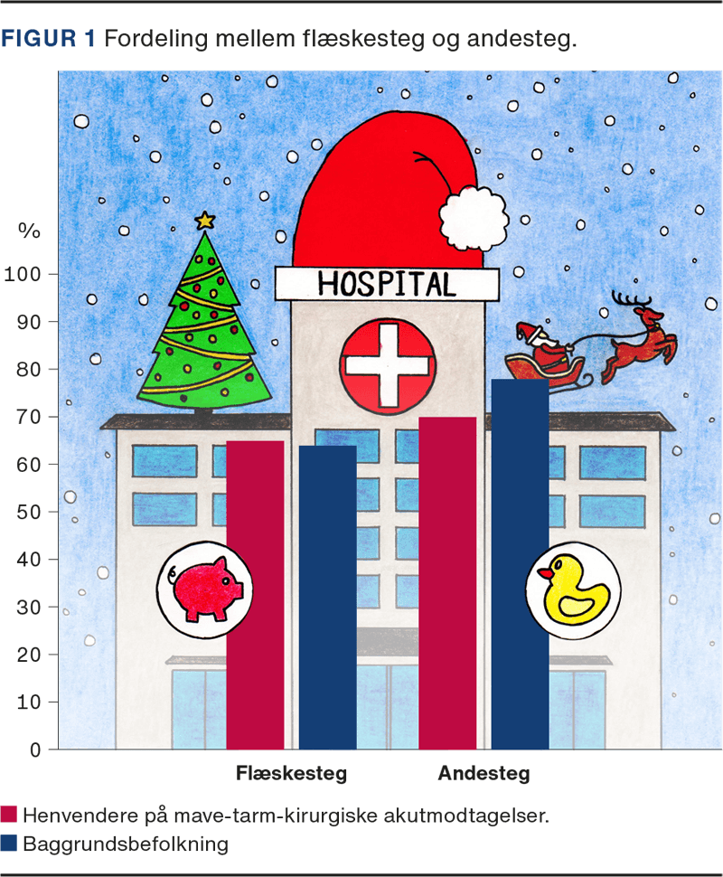 Vores resultater viser, at blandt henvendere på mave-tarm-kirurgiske akutmodtagelser juleaften og julenat har omtrent lige mange spist andesteg som flæskesteg (Figur 1), og der er ikke signifikant forskel på populationen og baggrundsbefolkningen, men multiple faktorer kan have haft indflydelse på dette fund.