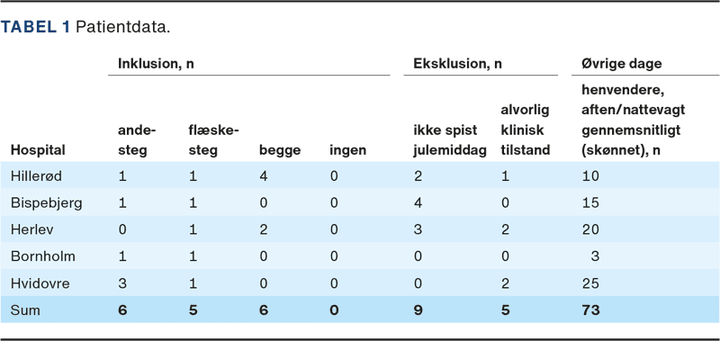 I alt 31 patienter henvendte sig på regionens mave-tarm-kirurgiske akutmodtagelser. Fem af patienterne var ikke tilgængelige for inklusion på grund af en alvorlig kritisk tilstand; de resterende 26 patienter kunne indgå i studiet: 17 blev inkluderet, og ni blev ekskluderet. 71% havde spist andesteg, og 65% havde spist flæskesteg. Den primære årsag til, at patienterne ikke havde spist julemiddag, var en akutmodtagelseshenvendelse kronologisk før julemiddagstid (Tabel 1).