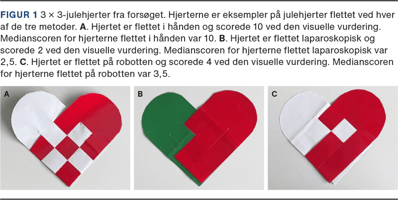 Efter en kort introduktion til det at flette et julehjerte samt en kort introduktion til anvendelsen af henholdsvis laparoskopisimulatoren og robotsimulatoren skulle alle deltagere flette tre julehjerter i et 3 × 3-mønster (Figur 1): et flettet i hånden (åben kirurgi), et flettet med laparoskopiske instrumenter på en fysisk tabletlaparoskopisimulator [10] (Figur 2) samt et flettet robotassisteret (Da Vinci Xi Robotic Surgical System, Intuitive Surgical) (Figur 2).