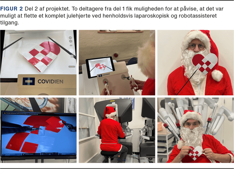 En speciallæge i kirurgi, som også deltog i forsøgets del 1, fik igen muligheden for at flette tre julehjerter robotassisteret. Denne gang uden en tidsgrænse. Første hjerte blev flettet for at teste gennemførligheden, andet hjerte blev flettet på tid, og tredje hjerte blev flettet iført julemandskostume samt med baggrundsjulemusik for at se, om den rette julestemning influerede på flettetiden. På samme vis flettede en hoveduddannelseslæge i kirurgi tre hjerter laparoskopisk (Figur 2).