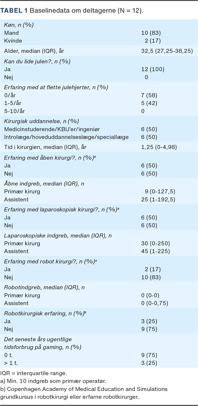 Tolv deltagere blev inkluderet i studiet, heraf tre medicinstuderende, otte læger og en medikoteknisk ingeniør. Baselinedata og kirurgisk erfaring kan ses i Tabel 1. Deltagerne i studiet var yngre, hovedsageligt mænd, som alle holdt af julen. Dog var det kun mindretallet af deltagerne (42%), som normalt flettede julehjerter ved juletid. Halvdelen af deltagerne var i gang med at uddanne sig til/eller var allerede kirurger (introlæger, hoveduddannelseslæger eller speciallæger). Halvdelen af deltagerne havde erfaring med laparoskopisk kirurgi, mens kun 17% havde erfaring med robotassisteret kirurgi.