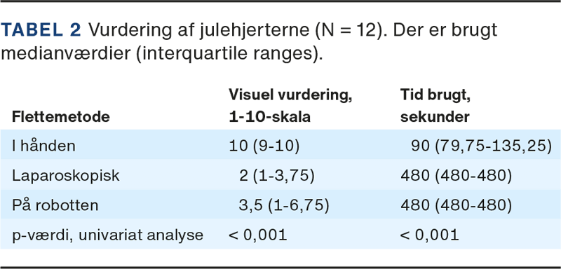 Hjerterne flettet i hånden var signifikant pænere end både hjerterne flettet laparoskopisk (p < 0,001) og hjerterne flettet på robotten (p < 0,001), mens der ingen forskel var i den visuelle score mellem hjerterne flettet laparoskopisk og hjerterne flettet på robotten (p = 0,378). De samme forskelle blev fundet med hensyn til tid brugt på julehjerterne, hvor det var signifikant hurtigere at flette hjerterne i hånden end både laparoskopisk og på robotten (p < 0,001 i forhold til begge). Faktisk var der ingen, der nåede at flette et færdigt julehjerte inden for tidsgrænsen med de to metoder (Tabel 2).